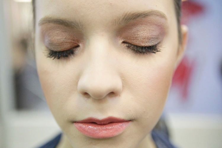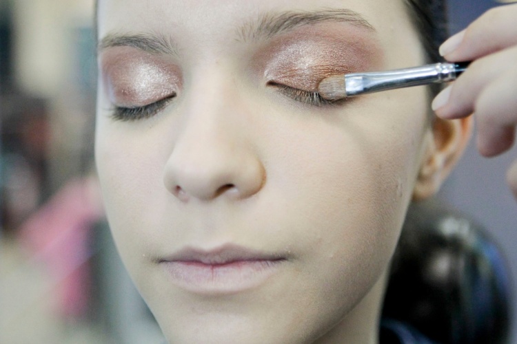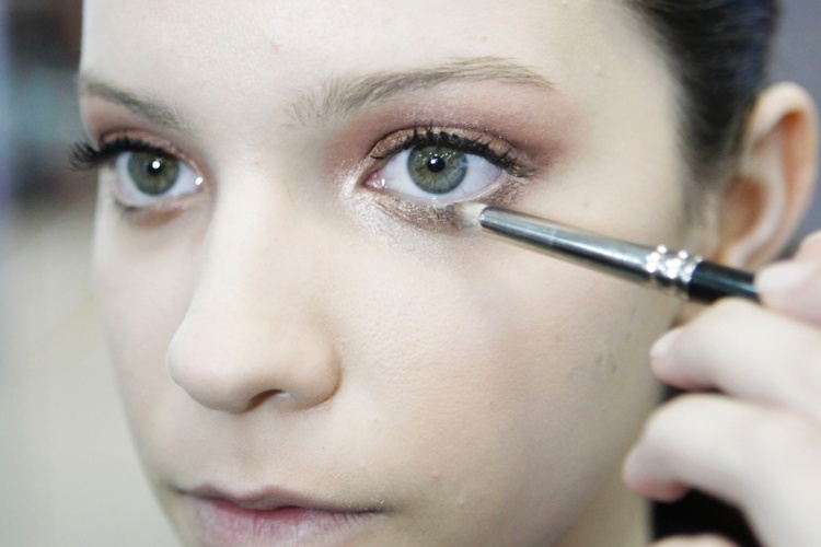 Misture o primeiro pigmento cobre com um pouco do fixador e passe embaixo dos olhos com um pincel fino. Siga até o canto interno dos olhos.