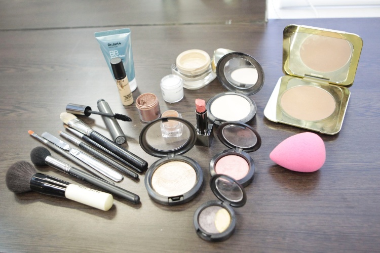 Para fazer a maquiagem você vai precisar de: soro fisiológico, BB Cream, base, corretivo, pó facial, fixador de sombra, pigmento cobre, pigmento caramelo, rímel preto, sombra marrom, blush bronze, blush rosado, iluminador, batom coral, rímel incolor e pincéis variados.